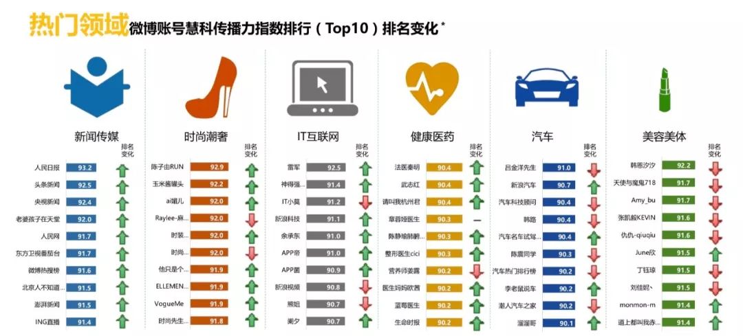 六大热门领域(新闻传媒、时尚潮奢、IT互联网、健康医药、汽车、美容美体)影响力TOP10整体排名变动不大,12月,六大热门领域仅“健康医药”类出现新账号新入榜,其余基本均在榜单内小幅变动。