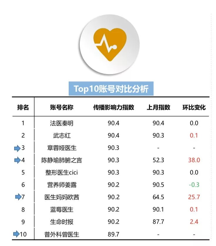 六大热门领域中,医药健康类影响力TOP10账号总体格局变动最大,最多新上榜及单体账号影响力指数变动最大的账号均来自该领域。12月,医药健康领域共出现2例新上榜账号,分别为“章蓉娅医生”和“普外科曾医生”,“陈静瑜肺腑之言”以环比上升38.0,成为单体账号影响力指数变动最大的账号。