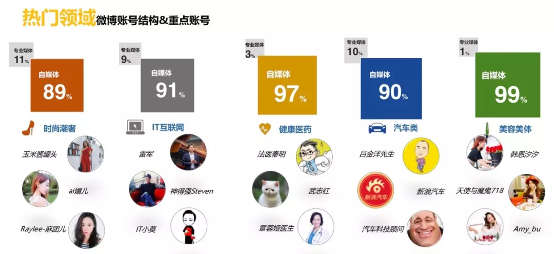 与注重专业度的新闻传播类相比,美容美体类KOL则是自媒体的天下,个人品牌账号占比最高,达到99%。时尚潮奢领域,专业深度解析仍具有相当的影响力,该领域影响力TOP10账号兼具专业度与草根性,自媒体比例为89%。