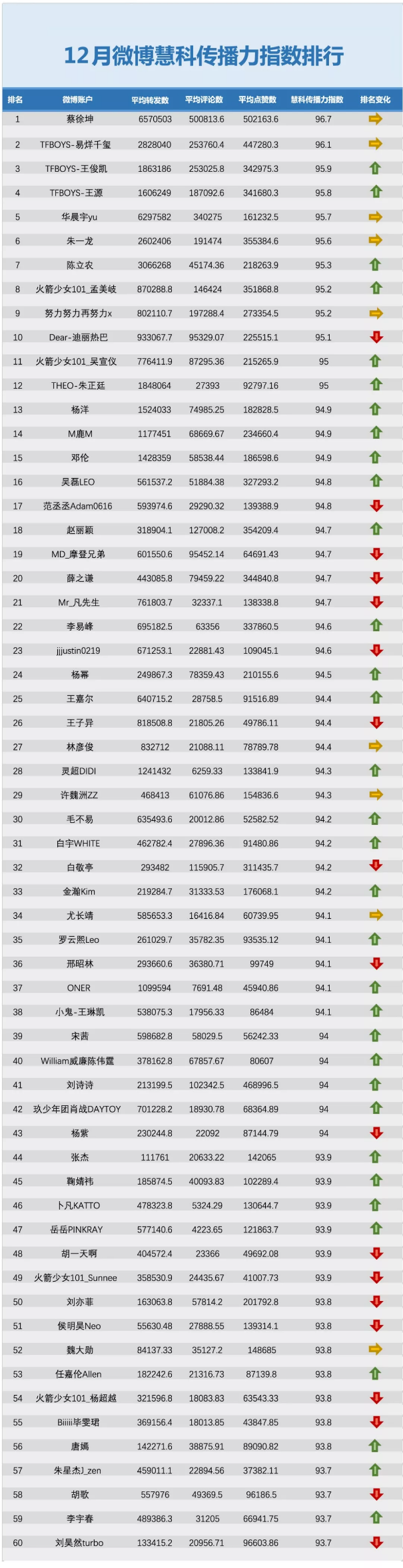 12月,时至年末,各类盘点、颁奖礼扎堆,受此影响,老牌微博KOL重回榜单前列。根据慧科AI大数据平台显示,12月微博KOL影响力TOP3依然集中于娱乐明星,传播力指数前三名的微博账号分别是“蔡徐坤”、“易烊千玺”、“王俊凯”,影响力稳固。