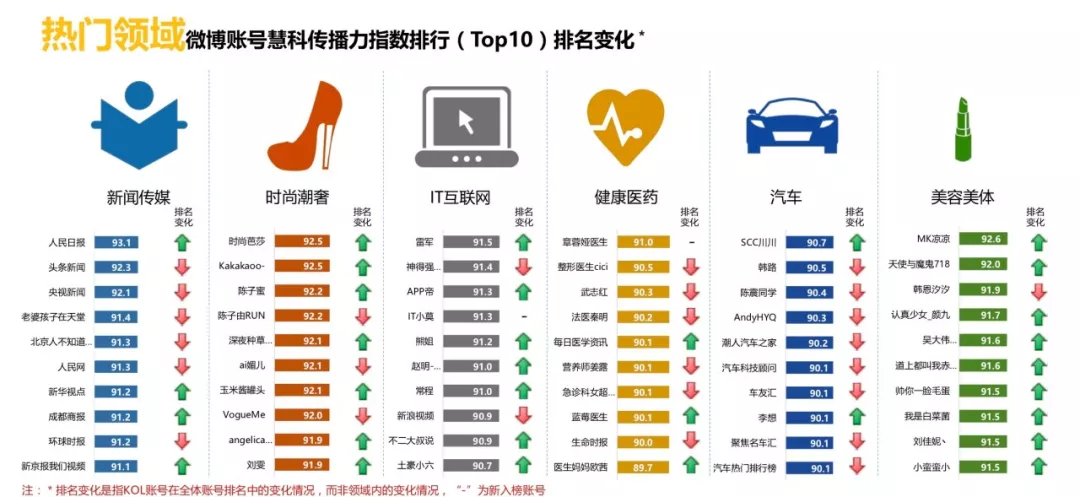 六大热门领域(新闻传媒、时尚潮奢、IT互联网、健康医药、汽车、美容美体)影响力TOP10整体排名变动不大,10月六大热门领域仅“IT互联网”类“IT小莫”一例账号新入榜,其余基本均在榜单内小幅变动。