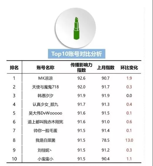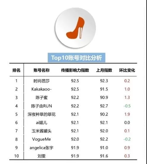 时尚设计类TOP10账号总体影响力格局稳固,TOP10账号传播影响力指数较上月变化值均控制在2%以内,账号主题核心圈层已养成,受众群体稳定,影响力长效、稳固。
