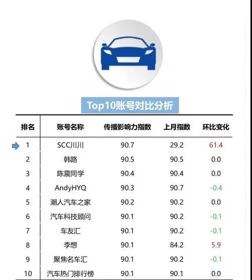 单体账号影响力指数变化最大的账号来自汽车分类的“SCC川川”账号,传播影响力指数达90.7,环比增长达61.4。