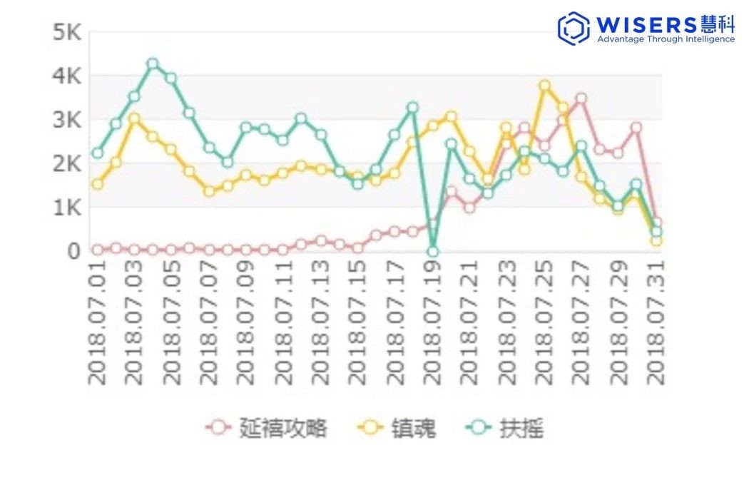 最晚开播,无流量明星加持,且为原创剧本的《延禧攻略》在7月19日开播之前,舆论声量较弱,开播之后,数据一路走高,上线4天,传播声量追平《镇魂》,上线7天,传播声量赶超《扶摇》。