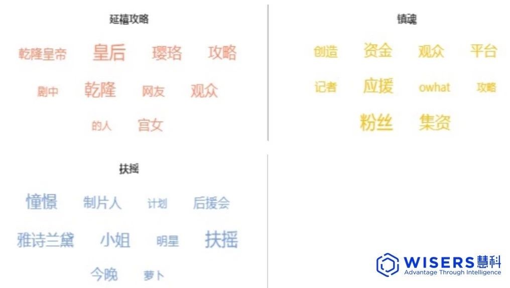 《延禧攻略》:热门词包括“皇后”、“乾隆”“璎珞”等,多为与剧情密切相关的词条,可见该剧传播的核心要素是以剧情带流量。