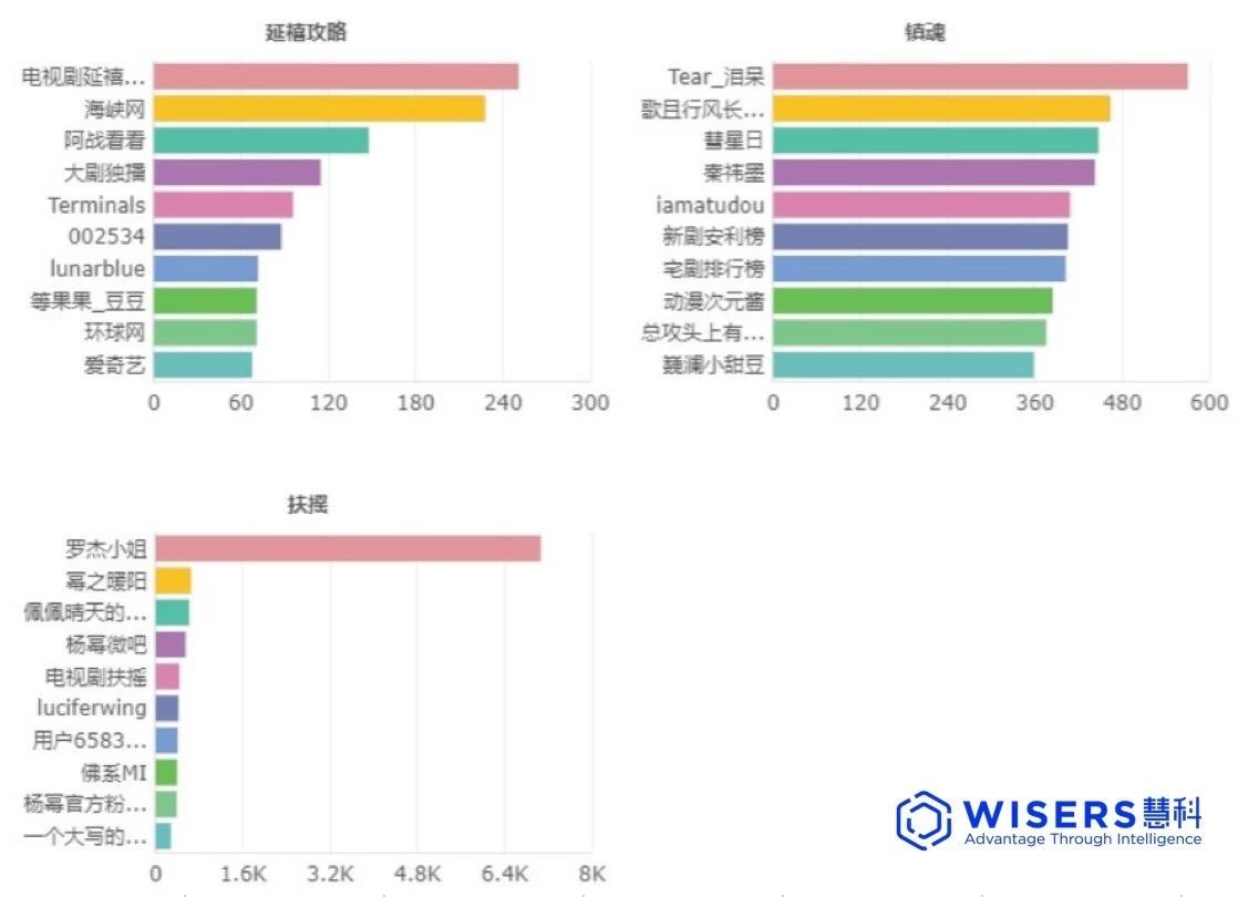 《扶摇》:大V独秀,专注主演。热门作者中,主演杨幂粉丝“罗杰小姐”一枝独秀,影响力惊人,其他热门作者中,主演粉丝也占比较大,粉丝效应拉动热度提升。