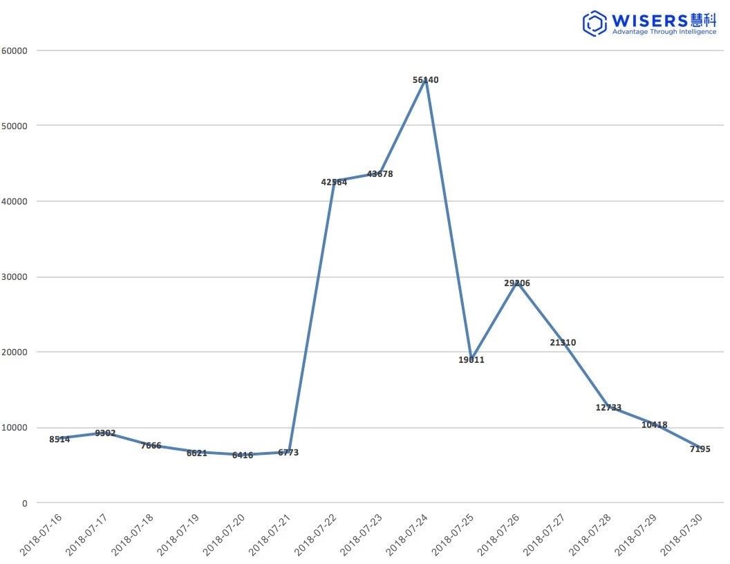 7月下旬,疫苗造假事件甚嚣尘上,因为事件牵涉范围甚广,相关讯息在短时间内呈爆炸性增长。利用慧科讯业WiseSearch,调取近半个月有关“疫苗”的全媒体监测数据可以看到,自7月21日事件爆发以来,高热度持续长达8天,疫苗相关传播量呈高位运行状态,日均报道量均高于10000篇次,事件爆发72小时内,传播声量持续冲高,逼近60000大关,于7月24日达到56140篇次。