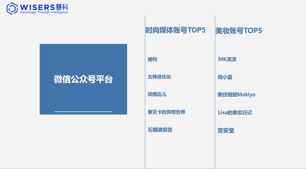 微信公众号内容分发以粉丝订阅和长文为主,侧重专业、深度解读。根据慧科榜单2017年12月数据显示,在微信公众号平台上,时尚媒体账号TOP5分别是她刊、女神进化论、妖精边儿、黎贝卡的异想世界、石榴婆报告。作为中国女性第一刊和最受欢迎女性公号,她刊内容多以鸡汤文见长,通过列举历史、当下诸多励志女性的故事,传递一定的正能量三观,俘获了一批女性用户;TOP5美妆账号分别是MK凉凉、周小晨、美伢姐姐Makiyo、Lisa的美妆日记、言安堂。