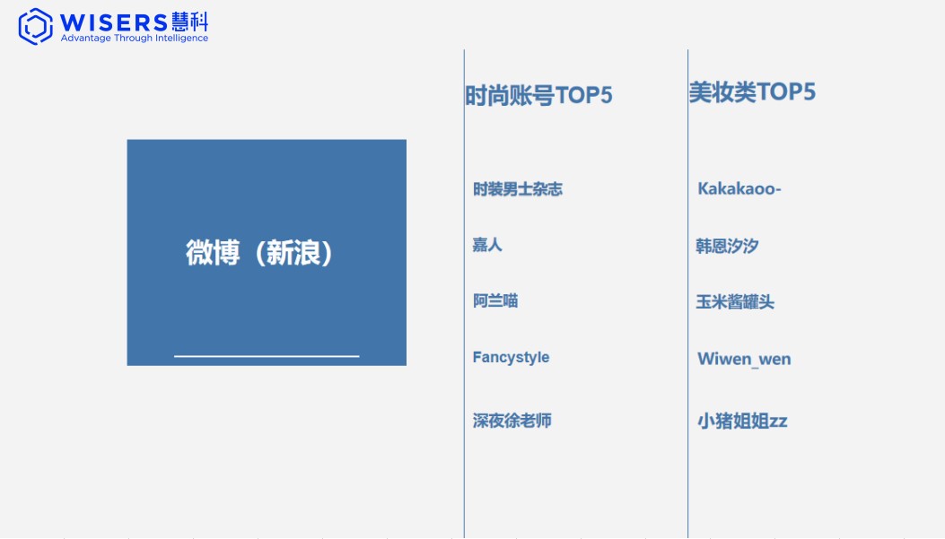 不同于微信公众号,微博内容以短文见长,明星名人、新闻、搞笑类内容传播较快,美妆类TOP5分别是Kakakaoo-、韩恩汐汐、玉米酱罐头、Wiwen_wen、小猪姐姐zz。