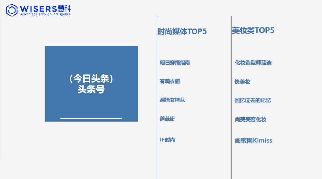 今日头条平台内容以长文为主,鉴于受众不同,今日头条上的新闻、娱乐或浅层次专业内容更易传播,其中TOP5时尚媒体分别是明日穿搭指南、有调衣橱、潮搭女神范、蘑菇街、IF时尚;美妆类TOP5分别是化妆造型师蓝迪、快美妆、回忆过去的记忆、尚美美容化妆、闺蜜网Kimiss等。