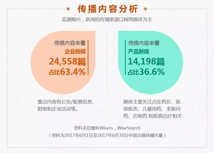 监测期内,新闻的传播渠道以网络媒体为主。传播内容来看企业新闻24,558篇,占比63.4%,重点内容有公告/股票信息、 财报和企业活动等。产品新闻14,198篇,占比达36.6%,媒体主要关注点在药价、医保医改、儿童用药、求医问药、仿制药 和疾病治疗相关。
