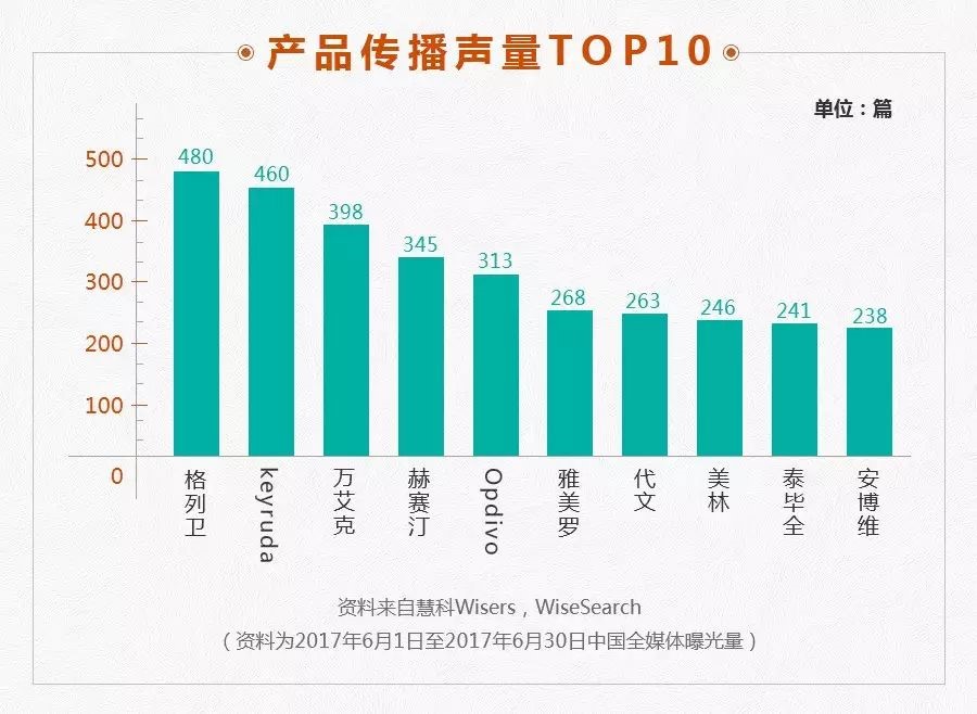 本监测期内,声量最高的品牌是格列卫,共监测到480篇,重点报道内容有“媒体:走私药品案频发 中国仿制药发展亟待提速”,均在内文中提及格列卫仿制药;排名第二的品牌是keytruda,多为PD1治疗和临床研究相关;排名第三的品牌是万艾可,重点在话题“降糖减肥药或含违禁成分 专家:网购保健品要当心”中提及伟哥。