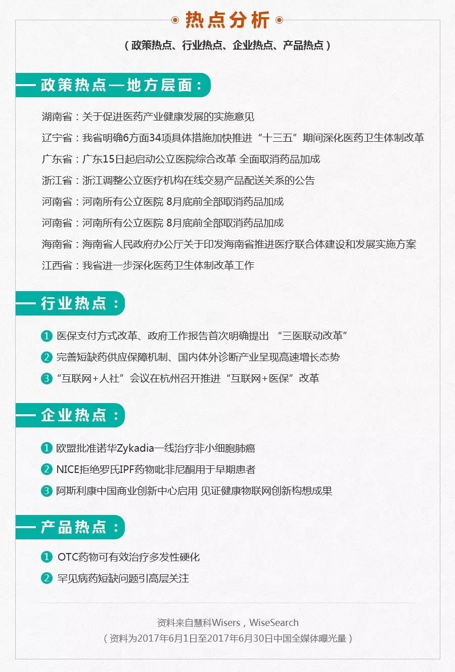 本月中整体医药大环境受到医保支付方式改革、委属委管医院改革和“十三五”卫生与健康科技创新专项规划等政策影响,各地纷纷实施试水,相关议题被媒体聚焦。长远来看,相关政策变动的总体趋势是推动中国制药企业向国际水平看齐。