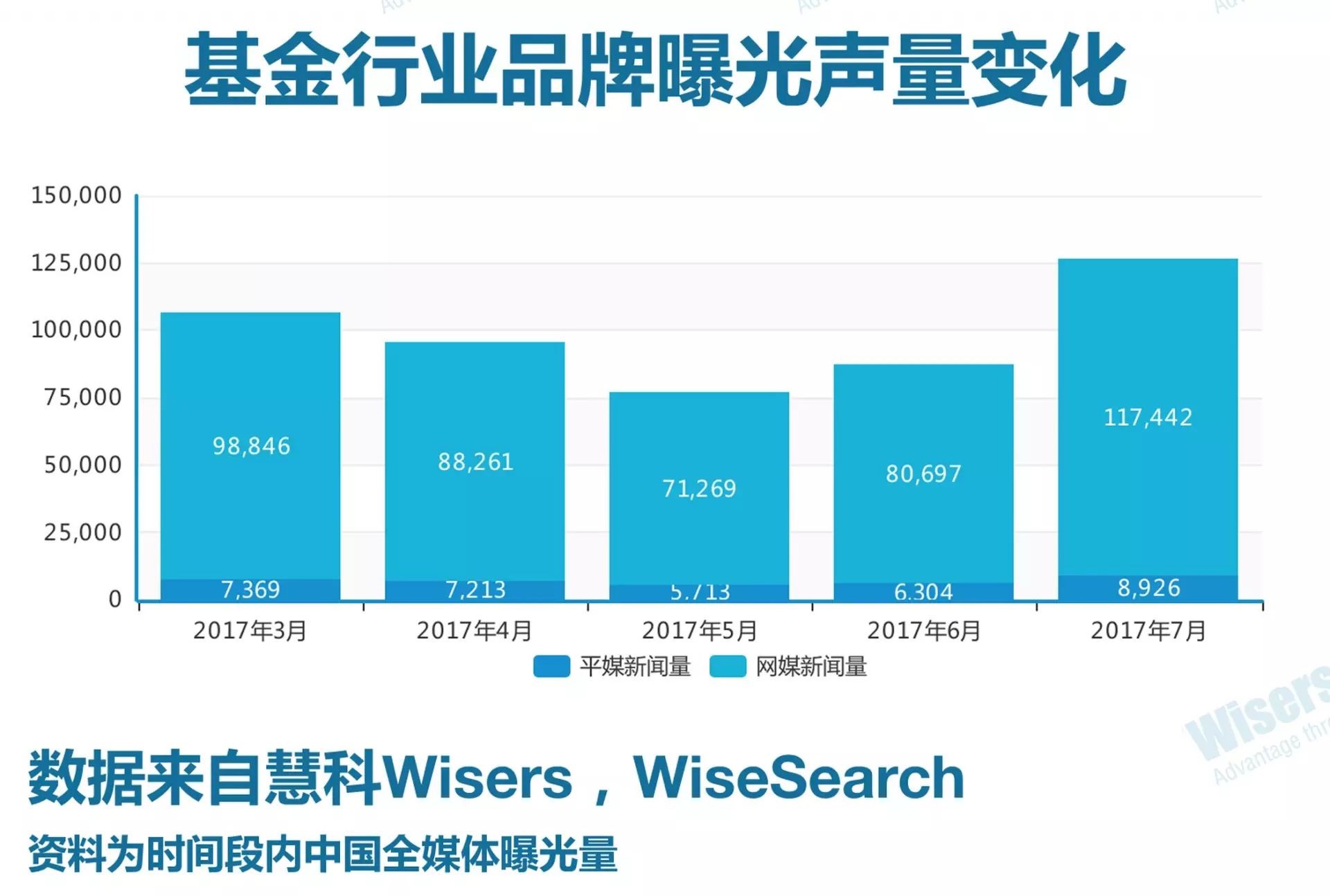 2017年7月,慧科讯业全媒体大数据平台监测到的基金行业新闻曝光总量为126,368篇,声量大涨,近五个月的数据对比如下: