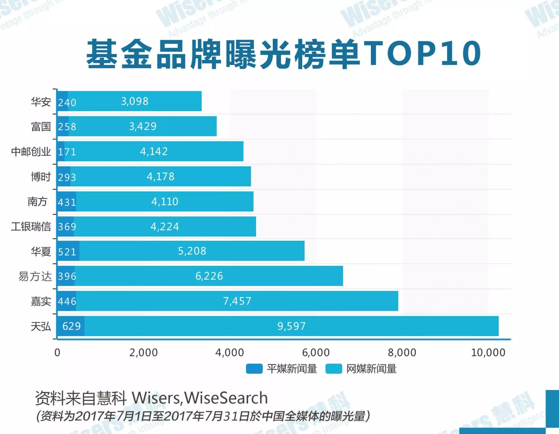 在品牌曝光方面,2017年7月行业90家基金公司总体新闻量排行中,天弘基金排名第一;天弘基金平媒和网媒新闻量均排名第一。Top10品牌合计声量份额43.9%。