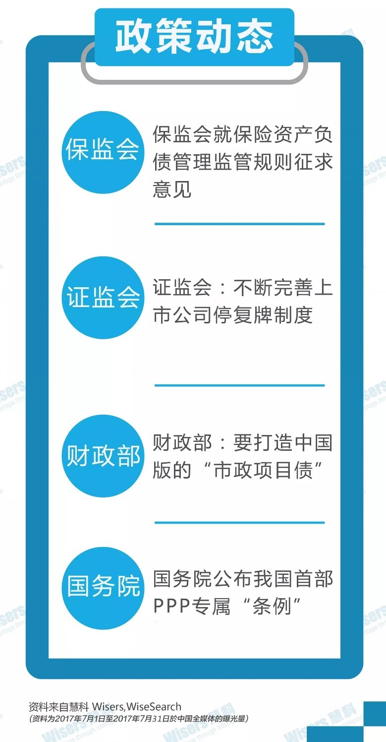 2017年7月,监管出台的政策有所减少。7月份证监会表示将不断完善上市公司停复牌制度,但目前新的规章制度仍未实质性出台。本月主要政策动态如下: