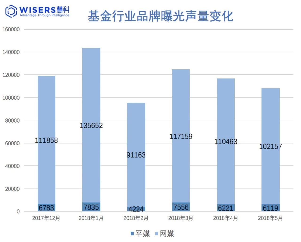 2018年5月,慧科讯业全媒体大数据平台监测到基金行业新闻102157条,本月总体新闻量环比下降7.2%;其中,平媒新闻量环比下降1.6%,网媒新闻量环比下降7.5%。近六个月网媒平媒新闻量数据对比图如下: