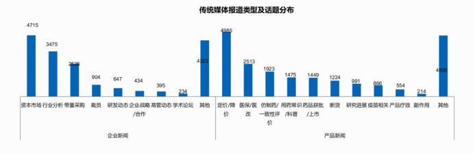 产品新闻20,889篇,占比达54.2%,产品层面新闻内容较为集中,药品定价/降价,医保/医改以及仿制药等相关报道较多。