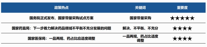 1月政策热点集中在:国家带量采购、着力解决药品领域不平衡不充分发展的问题和一品两规、药占比应适度调整等方面。