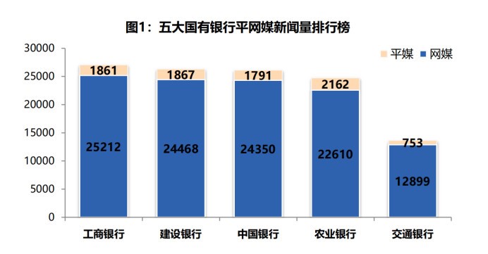 五大国有银行中, 工商银行的新闻总量最多,包括了1861篇平媒新闻与25212篇网媒新闻,建设银行排名第二,交通银行的新闻总量最少。