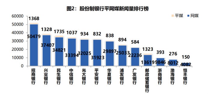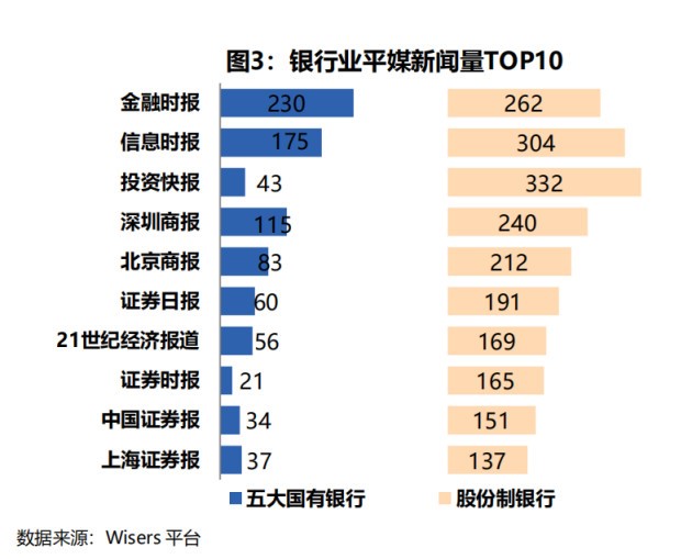 从银行类型来看,排名TOP10的平媒报道股份制银行的新闻量多于五大国有银行。