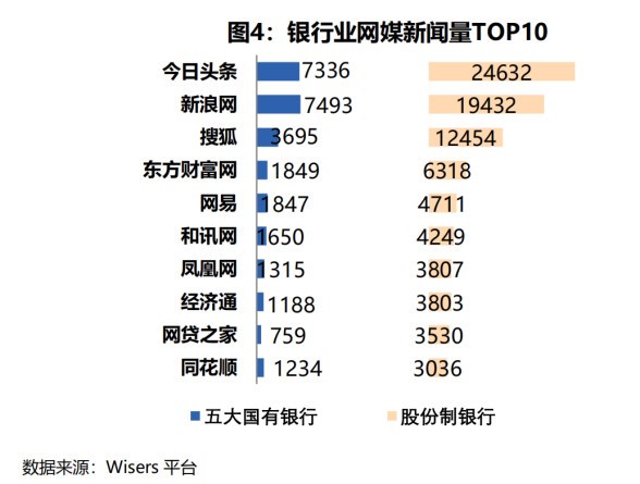 从银行类型来看,前十家网媒关于股份制银行的新闻量多于五大国有银行。
