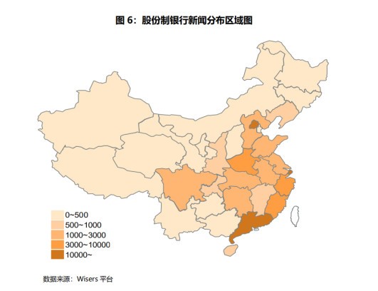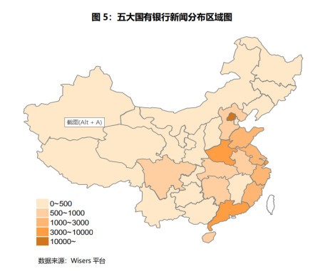 以下为五大国有银行和股份制银行的新闻报道的地域分布对比数据: