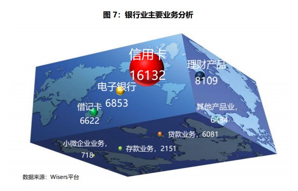 银行的各项主要业务中,关于“信用卡”的新闻量居首,共有16132篇报道,较上个月有所上升。