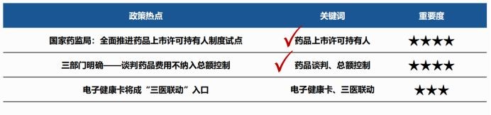 本月政策热点集中在:国家药监局:全面推进药品上市许可持有人制度试点、三部门明确——谈判药品费用不纳入总额控制和电子健康卡将成“三医互动”入口等方面。