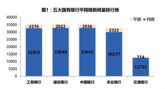 五大国有银行中, 工商银行的新闻总量最多,包括了2276篇平媒新闻与32832篇网媒新闻,建设银行排名第二,交通银行的新闻总量最少。