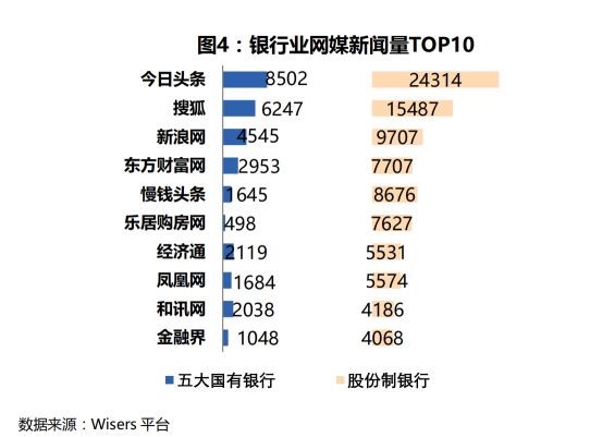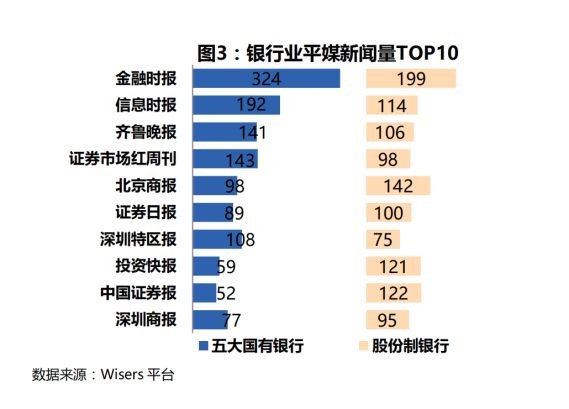 从银行类型来看,排名TOP10的平媒报道五大国有银行的新闻总量多于股份制银行。