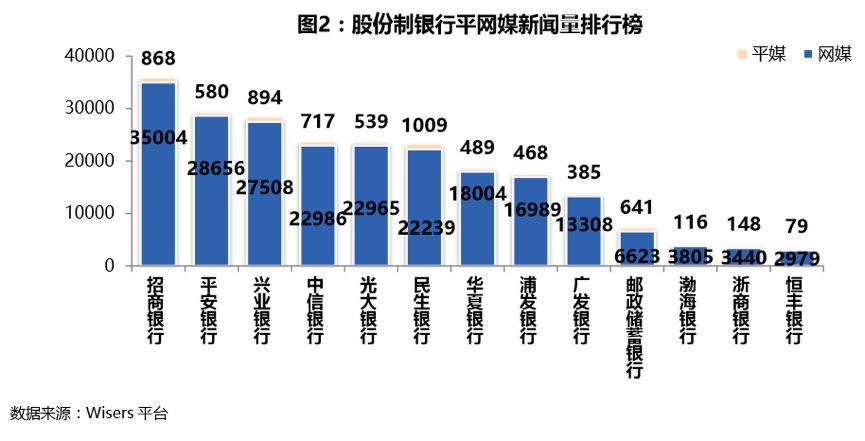 新闻量排行中,招商银行的新闻总量最多,平安银行和兴业银行的新闻总量分列二、三位,恒丰银行新闻总量最少。具体数据如下: