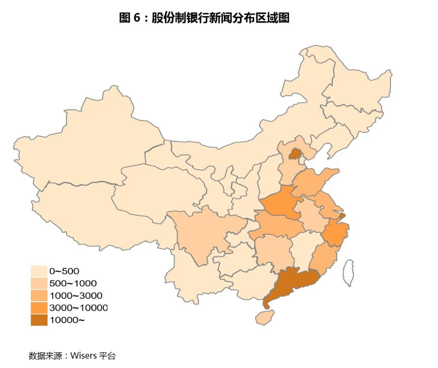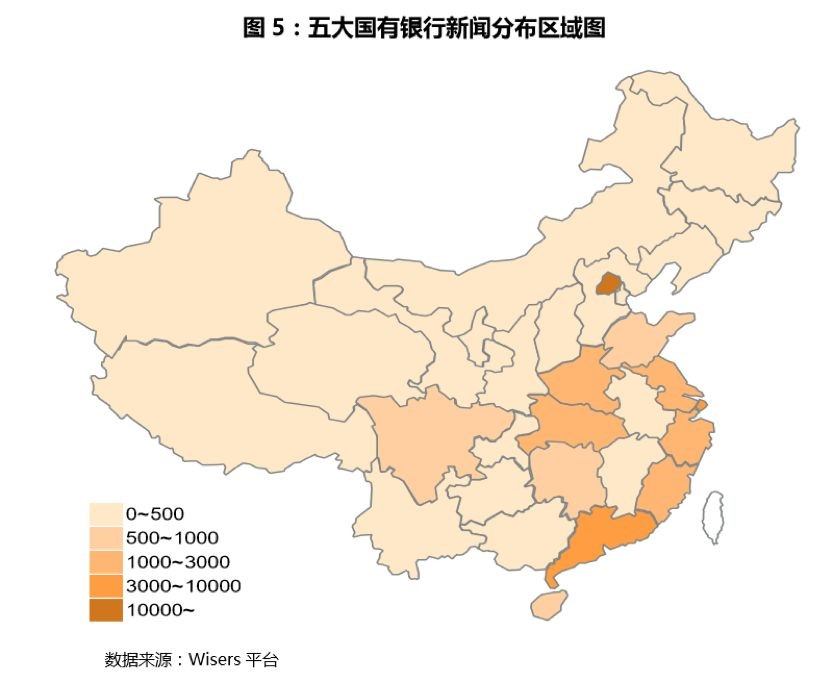 以下为五大国有银行和股份制银行的新闻报道的地域分布的对比数据: