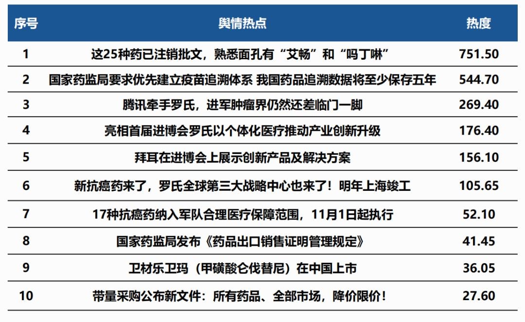 11月,医药行业积极参与进博会,受到媒体关注。此外,罗氏集团个体化医疗、药物注销等事件也成为热议事件。