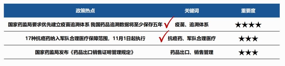 本月政策热点集中在疫苗溯源、抗癌药军队合理医疗、药品出口等。具体如下: