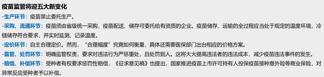 针对疫苗市场屡爆负面, 11月11日晚,国家市场监督管理总局发布《疫苗管理法(征求意见稿)》,来势“凶猛”,疫苗行业迎来最严立法,根据《意见稿》,疫苗监管将在生产、采购、定价、监管等五大方面迎来新变化,希望借立法,肃清行业乱象。
