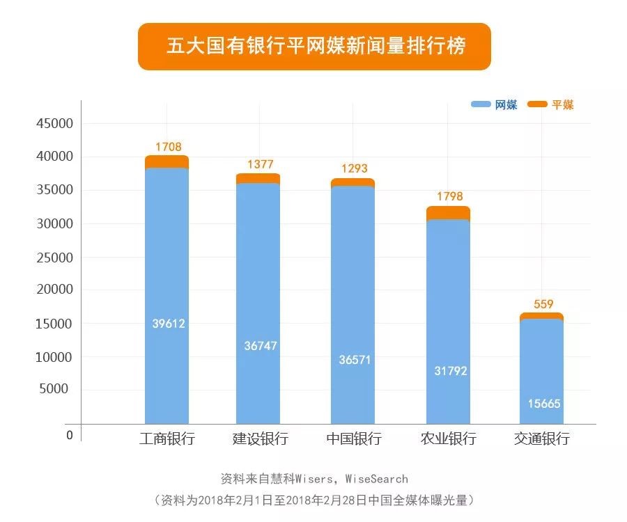 2018年2月,慧科讯业全媒体大数据平台监测到五大国有银行新闻有167122条,占银行业新闻监测总量的29.39%。