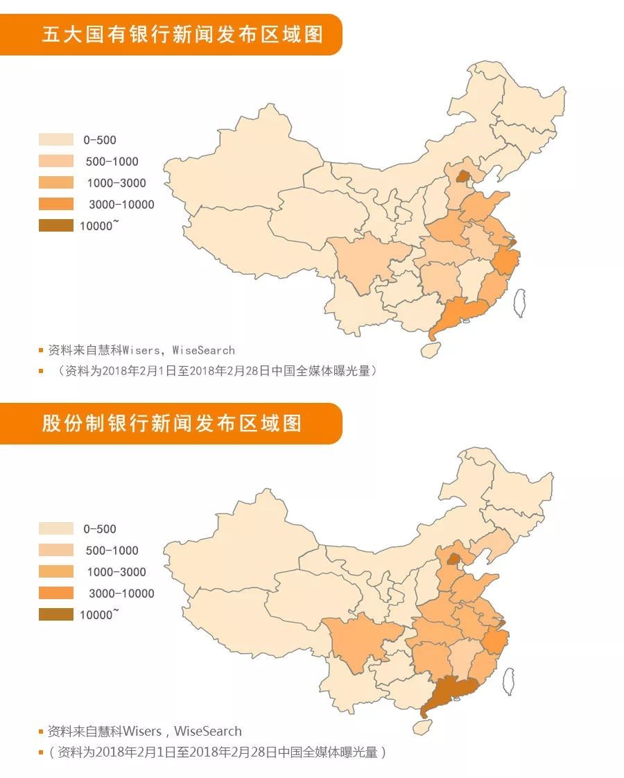 以下为五大国有银行和股份制银行的新闻报道的地域分布的对比数据: