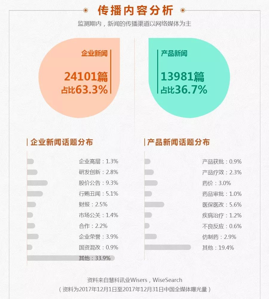 △监测期内,新闻的传播渠道以网络媒体为主。传播内容来看企业新闻24,101篇,占比63.3%,重点内容有行贿丑闻、企业荣誉和股价信息等。产品新闻13,981篇,占比达36.7%,媒体主要关注点在医保医改、仿制药和药价方面。