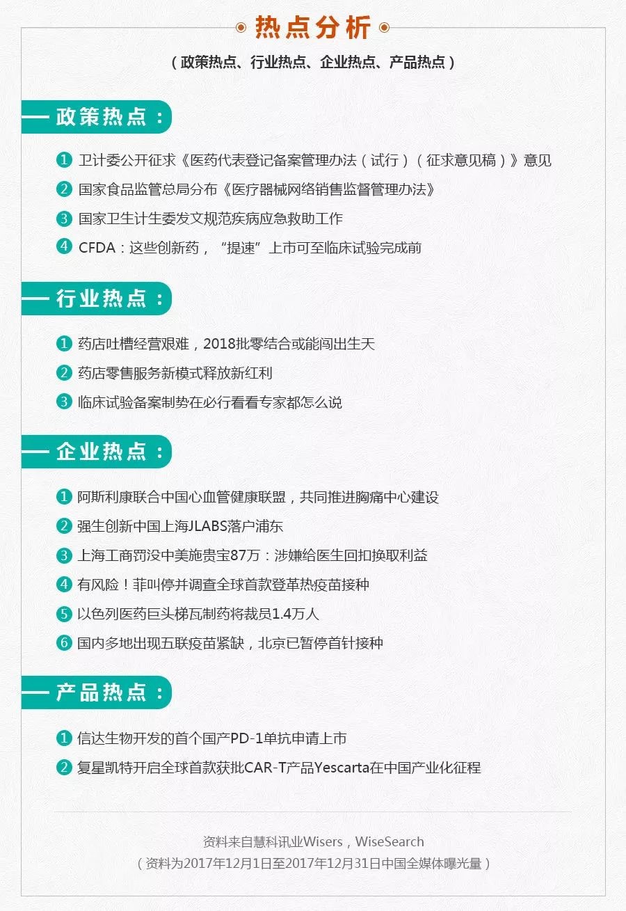 【摘要】本周慧科讯业全媒体行业大数据时间,慧科为大家呈上2017年12月《医药行业传播分析报告》内容,为您呈现2017年12月国内医药行业的新闻传播态势、传播热点和市场分析。本月传播较广的新闻有“行业集中度提升 推进企业国际化 中国药企跨境并购加速”“人民日报刊文评莎普爱思事件:莫让行贿药企以小博大” 和“拜耳诺华等药企6106个药品弃标上海”等。此外,企业财报等相关内容也受到媒体关注。