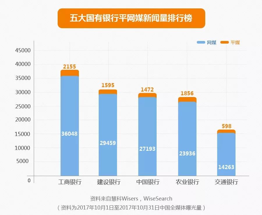 2017年10月,慧科讯业全媒体大数据平台监测到五大国有银行新闻有145638条,占银行业新闻监测总量的26.31%。五大国有银行中,工商银行的新闻总量最多,包括了2599篇平媒新闻与35454篇网媒新闻,建设银行排名第二,交通银行的新闻总量最少。