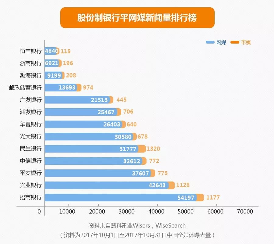 股份制银行新闻有407940条,占比为73.69%。其中招商银行的新闻总量最多,兴业银行和平安银行的新闻总量分列二、三位,恒丰银行新闻总量最少。以下为详细数据: