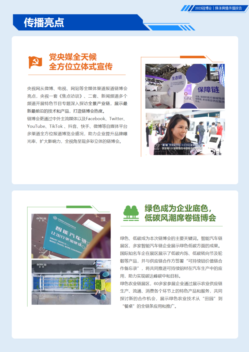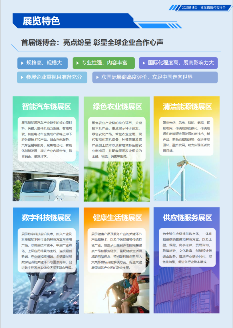 首届链博会以“共建、共促、共享” 为原则,设置智能汽车链、绿色农业链、清洁能源链、数字科技链、健康生活链等5大链条和供应链服务展区,展示各产业链上中下游先进技术、产品,以及银行、保险、贸易咨询、商事法律、文化教育、创新设计等供应链服务,打造集贸易促进、投资合作、创新积聚、学习交流等功能于一体的高端平台。其中,数字科技链展区的前沿技术、新型产业及科技方案、AR及裸眼3D等黑科技,智能汽车链展区中,新能源汽车产业链中的核心原材料、关键元器件、动力系统、智能驾驶、电动车等热门趋势,吸引众多观众驻足和洽谈。更多展区特色,欢迎扫描文末二维码下载慧科讯业《2023链博会媒体舆情传播报告》。