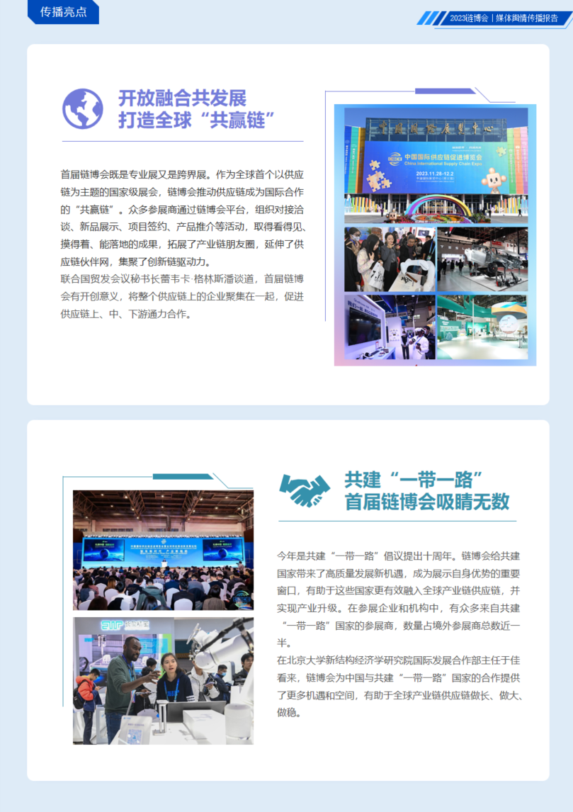 首届链博会既是专业展又是跨界展。作为全球首个以供应链为主题的国家级展会,链博会推动供应链成为国际合作的“共赢链”。众多参展商通过链博会平台,组织对接洽谈、新品展示、项目签约、产品推介等活动,取得看得见、摸得着、能落地的成果,拓展了产业链朋友圈,延伸了供应链伙伴网,集聚了创新链驱动力。想了解更多,欢迎扫描文末二维码下载慧科讯业《2023链博会媒体舆情传播报告》。