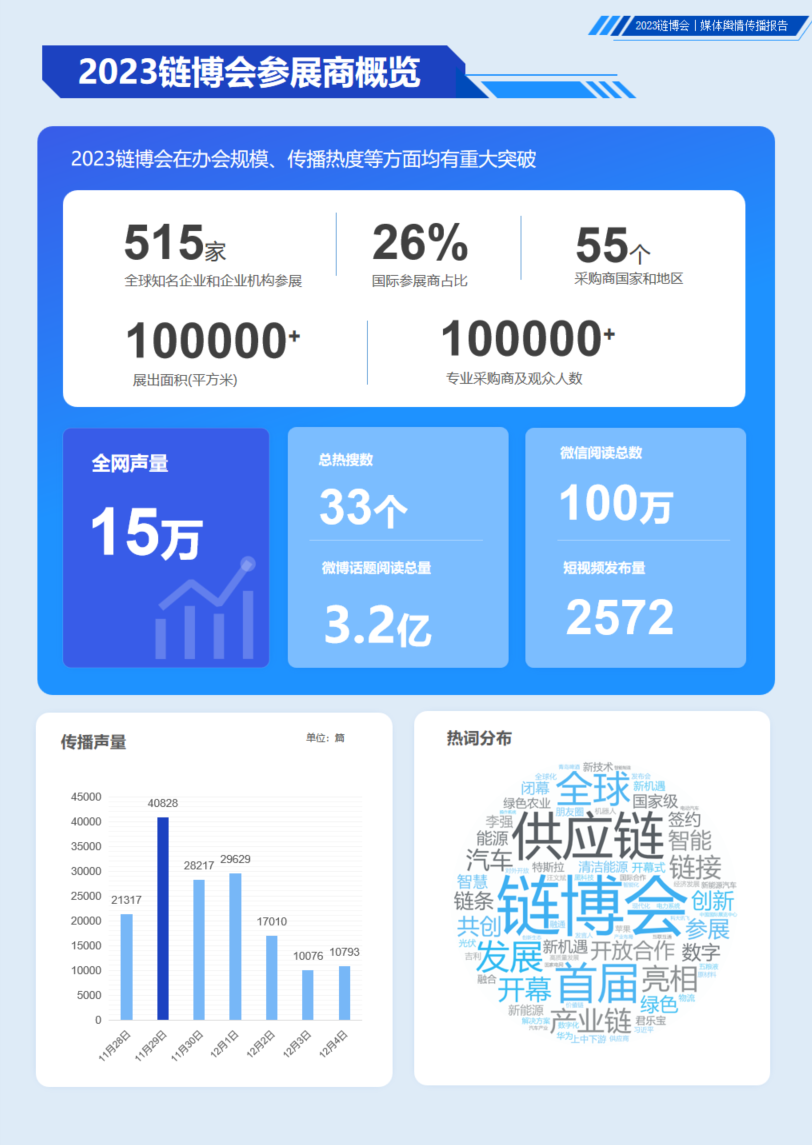 本届链博会有约来自55个国家和地区的515家全球知名企业和机构参展,吸引约10万采购商和观众。慧科讯业智能大数据平台对全网15万数据分析发现,关于“链博会”话题多次登上热搜引起广泛关注和讨论,总热搜量为33个,微博平台的话题阅读量近3.2亿。
