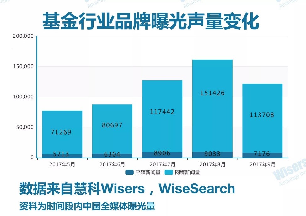 2017年9月,慧科讯业全媒体大数据平台监测到基金行业新闻曝光总量为120,884篇,较上月有所下降,近半年对比态势保持良好,近五个月的数据对比如下: