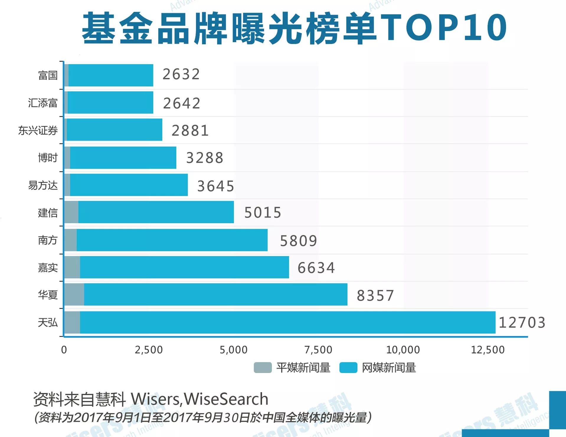 品牌曝光方面,90家基金公司总体新闻量排行中,天弘基金继续排名第一;华夏、嘉实两基金品牌分别排名二、三名。