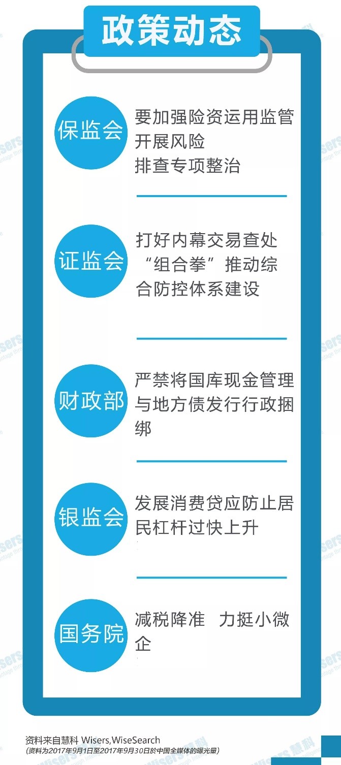 2017年9月,监管出台的政策相对较少。监管层方面,仍以“去杠杆”“风险防控”“严控内幕交易”“穿透式监管”“力挺中小微实体经济”作为核心思想。监管重点主要集中在流动性风险、协作监管、券商风险等方面。本月主要政策动态如下: