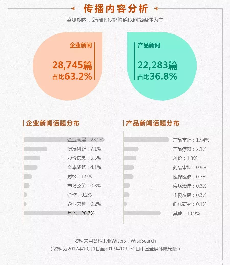 △监测期内,新闻的传播渠道以网络媒体为主。传播内容来看企业新闻18,831篇,占比63.2%,重点内容有企业高层、研发创新和股价信息等。产品新闻10,971篇,占比达36.8%,媒体主要关注点在产品审批、产品疗效和药价方面。