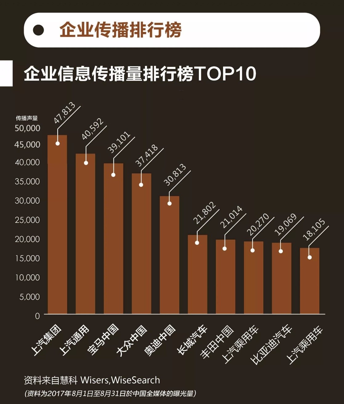 本月企业信息传播声量TOP10车企中,上汽集团、上汽通用、宝马中国三家车企分别以47,813篇、40,592篇、39,101篇的新闻传播量排前三名。